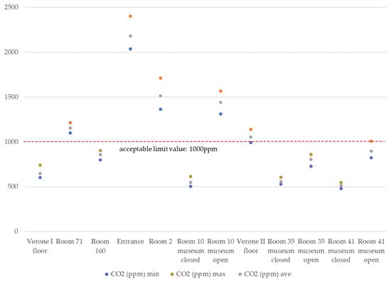 Figure 7 shows, for each analyzed room and monitoring period, the minimum, average and maximum measured values for carbon dioxide concentration, which were compared with value ranges considered acceptable for people, i.e., 1000 ppm [].