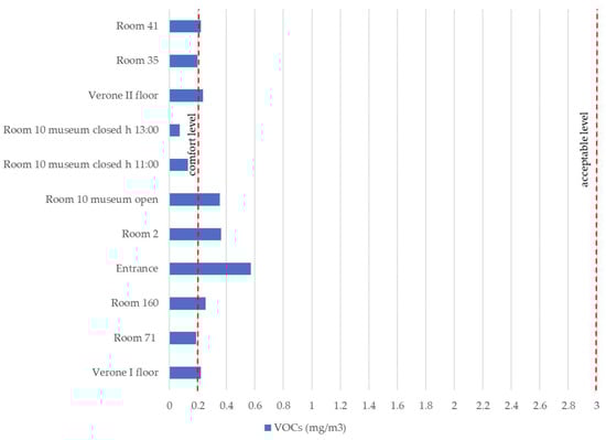 In Figure 8, for each analyzed room, the measured values for VOCs concentration are reported and compared with comfort (<0.200 mg/m3) and acceptable (0.200 ÷ 3 mg/m3) values for these pollutants [,]. For Room 10, one of the most visited areas, samples were also taken on a closed day of the museum (3 June 2019), during which there was only one guided tour by a small group of visitors at 11:00, while the measurement of 13:00 refers to the museum totally without visitors.