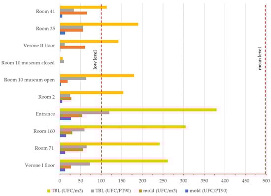 Figure 9 reports, for each analyzed room, the results of the sampling carried out for biological pollutants compared with reference values reported in Table 4. The results expressed in CFU/m3 were obtained from active sampling, while those expressed in CFU/PT90 refer to passive sampling of TBL and mold. The greater concentration detected by active sampling compared to passive is a natural consequence of the sampling technique: passive sampling does not force the capture of microorganisms and, thus, lower values are expected.