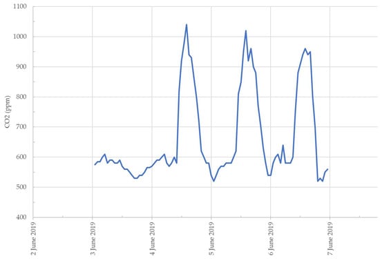 Trend of CO2 values (ppm) for the period from 3 to 6 June 2019 detected by the continuous monitoring system in Room 160 owned by the museum.