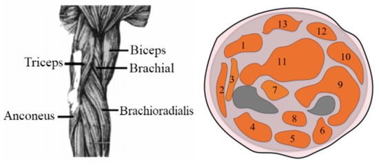 Figure 2 depicts the major contribution of the muscle under the isometric contraction of the elbow joint [25]. Therefore, we can consider that the major muscles involved in the completion of isometric contractions are the biceps. By studying the sEMG signal of the biceps, we can search for the relationship between elbow interaction force and sEMG signals.