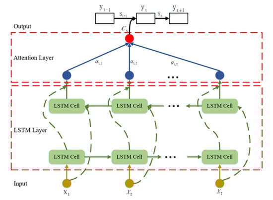 where, is output at time step , respectively, is the input of the current moment, is the output of the BiLSTM model, is the weight of the attention layer, the score is the inner product, is output of hidden layer, is a summary of the previous period which from 0 to (t − 1) time step.