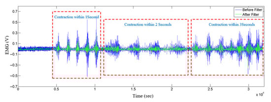 We used the moving average filter method to separate the raw sEMG time series into nonlinearity time series and non–stationary time series. The chosen sliding window size is 8. Figure 9 shows the filter effect on the raw sEMG time series of the biceps. Considering the limited space of the picture display, part of the data under 1 s, 2 s, and 3 s contraction tasks were captured and connected to facilitate the comparison of the effectiveness of the algorithm.