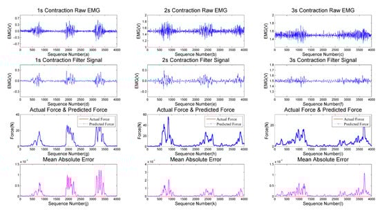We compared the experimental results under three contraction times (1, 2, and 3 s), as shown in Figure 10. The subfigure (a–c) shows the raw sEMG signal. The subfigure (d–f) shows the EMG signal processed by the decoupling algorithm. The subfigure (g–i) shows the comparison between the actual measured interaction force and the predicted force. The subfigure (j–l) shows the mean absolute error of the actual measured interaction force and the predicted force.