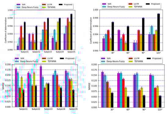 In order to comprehensively evaluate the effectiveness of the algorithm, NRMSE and coefficient of determination are taken into account to evaluate the performance of the model [39,40], which are shown as below. The different window size, joint angle, and other state of the art methods were compared, and the comparison results are shown in Figure 11 and Figure 12.