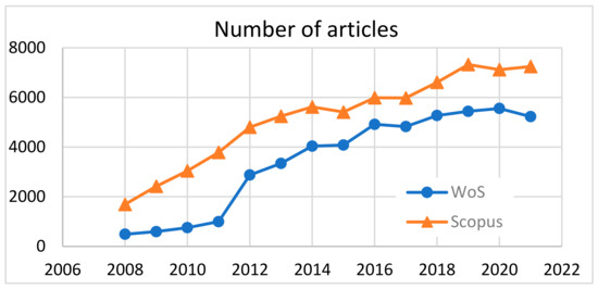 Number of published articles in the WoS and Scopus database (search for the topic “wind turbine”).