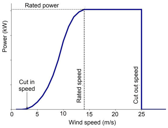 These improvements include further enhancements to the rotor blade aerodynamics, wind farm operational management system, and maintenance and fault diagnosis system, resulting in improved wind farm efficiency, reliability, and availability [3]. The power curve of a wind turbine (Figure 5) shows the output power of the turbine at different wind speeds. The annual electricity production of a wind turbine depends, among other things, on two important points on the power curve: the wind speed at which the wind turbine is turned on, and the wind speed at which the wind turbine is turned off, so that there is no excessive stress and damage to the parts of the wind turbine if the wind speed continues to increase.
