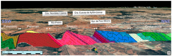 The Keuper facies culminate in a dolomitic section present throughout the northern sector of the Castilian branch of the Iberian Mountain Range (Cordillera Ibérica), “Dolomías tableadas de Imón” formation, still from the Upper Triassic (Norian) [14]. From a cartographic point of view, this formation is integrated with the Cortes de Tajuña Fm., formed by dolomitic breccias and dolomites of massive aspect; they show a combined thickness of about 112 m that can be divided into up to four sections or members.