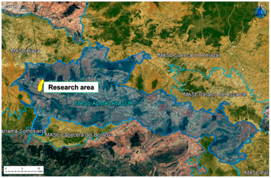 The Jurassic aquifer formation is confined and disappears to the north, under the Cretaceous aquifer formation, which, at the same time, goes under Tertiary materials towards the Almazán basin. There, it constitutes the main deep aquifer, which feeds the Tertiary detrital materials and significant springs and watercourses, constituting the important Groundwater Body of the Almazán Basin, as well as that of the Páramo de Escalote. The following figure (Figure 2) shows the definition of the Almazán Sur Groundwater Body and the bordering bodies, as well as the location of the research area within the body.
