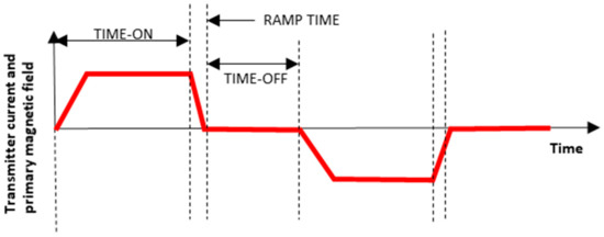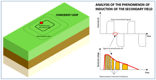 According to Carrasco [18], time-domain electromagnetic sounding, commonly referred to as TDEM, consists of injecting a constant current into a loop or transmitting coil (TX), generating a constant primary magnetic field. When the current flowing through the transmitting coil (TX) is suddenly interrupted, the primary magnetic field is no longer constant and decreases in value over time until reaching zero. According to Faraday’s law, when a body is exposed to a time-varying magnetic field, a series of electromagnetic inductions of electric currents occur in the subsurface (Figure 4). These currents flow in closed paths through the subsurface, migrating in depth and laterally, decreasing in strength over time and, in turn, generating a decreasing transient secondary magnetic field at the surface [19].
