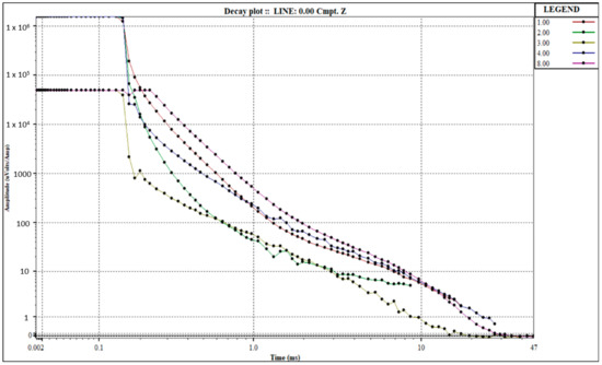 The TDEM surveys were carried out using the Terra-Tem equipment (Figure 8) designed by Monex GeoScope, with a “coincident loop” configuration and with square loops (transmitter and receiver) of 100 m on each side, using a minimum stacking of 1000 measurement repetitions per channel and testing various gains to minimise the effect of any environmental electromagnetic noise. The results of the different decay curves obtained in the field are shown using the Terratem equipment software “TEM Plotting Program v 2.0.0” from Monex GeoScope (Figure 9).