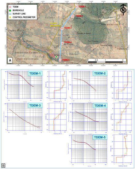 Interpreted TDEM geoelectric profile (occam inversion data), including position of the proposed catchment borehole (A) and geological cross-section of the TDEM profile based on the 1:50,000 geological cartography of Spain (B).