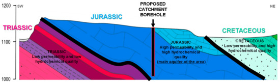 On the other hand, it is important to avoid the geoelectric unit number one, associated with the poor known hydrogeological characteristics of the Triassic materials (low hydrochemical quality and insufficient flow). Triassic materials are the low permeability substrate with the contribution of substances of an evaporitic nature that particularly influence the quality of the resource. Therefore, the objective is to drill the maximum possible thickness of saturated Jurassic materials without touching the Triassic materials (Figure 12).