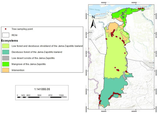 According to the ecosystem classification system of Ecuador [13], we can find four types of ecosystems in the study area: (1) The deciduous forest of the Jama-Zapotillo lowland, (2) the low forest and deciduous shrubland of the Jama-Zapotillo lowland, (3) the mangrove of the Jama-Zapotillo, and (4) the low desert scrubs of the Jama-Zapotillo. In this study, we sampled 118 plots of 20 × 20 m surface areas in two of the different dry forest types (the low deciduous forest of the Jama-Zapotillo and low forest and deciduous shrubland of the Jama-Zapotillo) and in the mangrove (the mangrove of the Jama-Zapotillo) (Figure 1). Sampling locations were selected following a random design, but locations with difficult or impossible access were discarded. In each 20 × 20 m plot, four 5 × 5 m subplots were selected to study shrubs, and four 1 × 1 m subplots to study herbs. Life form classes were identified according to Raunkiaer’s classification [14]. Field sampling was carried out during the rainy season to achieve a better identification of the species, according to the flowering and fruiting times of most of the known species. The physiognomies of the plants (herbaceous, shrubs, and trees) were noted in the field during sampling. Each of the plots were georeferenced with a handheld GPS (GARMIN GPSMAP 65) with a 5 m horizontal accuracy. The list of flora of the REAr created by Molina Moreira in 2017 [11] was used as the basis for the study. This is the latest and most complete study conducted so far in the REAr, and included 291 species from 64 families. The specimens from this area that have already been deposited in the Reinaldo Espinoza Herbarium of the Universidad Nacional de Loja (LOJA), the Herbarium of the Universidad Técnica Particular de Loja (HUTPL), the Herbarium of the Universidad de Guayaquil (GUAY), and the Herbarium of the Universidad de Almería (HUAL) [15], were also studied.