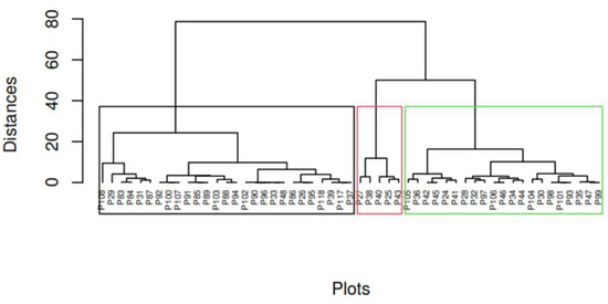 With these indicators obtained at the plot level in the two sampled ecosystems, a hierarchical cluster analysis was performed using Sorensen’s distance measure [19,20]. The Ward method was then used to achieve the highest clustering structure coefficient. The analysis was performed using the Agnes function of the cluster ‘factoextra’ package in the R software, version 4.2.1. [21].