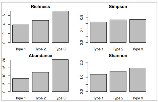 Significant differences in species richness (p-value = 1.27 × 10−6), abundance (p-value < 2 × 10−16), and Shannon index (p-value = 0.00712) were identified among the three forest types identified for this ecosystem. Forest type III had the highest species richness (7.00), abundance (20.20), alpha diversity with Simpson’s index (0.72), and Shannon index (1.63), which represent characteristics that define a well preserved forest (Figure 5). In type III, the following species stood out: Cochlospermum vitifolium, Handroanthus chrysanthus, Caesalpinia glabrata, and Geoffroea spinosa. The maximum height that was determined in this forest was 13 m.