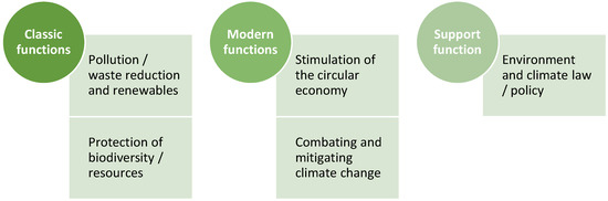 The sustainability-related functions associated with digital twins have been defined by the authors through brainstorming based on experience (Figure 2). The brainstorming session was led by the principal investigator and took place over a limited period of 1 h, with each author being asked to contribute only concrete situations they have encountered during research or consultancy projects in manufacturing companies. Next, the data was processed, redundancies were eliminated, and the remaining functions were stratified in a chronological manner into classic functions (stemming from the original environmental movements from the 1970s to 1990s), modern functions (resulting from mature international treaties from 1990s to the 2010s), and a support function based on the European Green Deal [40], which is an advanced strategic approach applicable to the EU and its members.