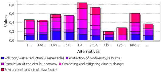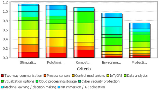 In Figure 4, the detailed representation shows data analytics and visualization options as frontrunners, while cloud processing/storage and cyber security protection rank the lowest. Additionally, the figure shows the contribution of each of the attributes to addressing the environmental topics in a proper manner.