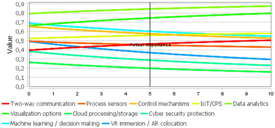 From the report generated by the MCDA 7.6 software for Figure 5 (and similar graphs for the other functions), we can deduce that combating and mitigating climate change is the most sensitive topic to be implemented in sustainability in the present. A mere 10% change in the perception for this function has the potential to determine a restructuring of the development effort. As society becomes more focused on combating climate change, the industrial sector is increasingly being called to come up with solutions and implement them quickly and with visible results.