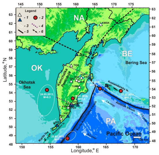 Figure 1. Map of the Kamchatka Peninsula showing the location of seismic stations (Table 1), earthquake epicenters with Mw = 7.2–8.3, and tectonic plate boundaries: 1—seismic stations with codes indicated: blue designates coastal stations, and white designates continental stations; 2—earthquake epicenters; 3—areas of earthquake sources according to [20,21,22,23,24]; 4—boundaries of the northern, central, and southern groups of stations (from top to bottom); 5—northwestern and northeastern boundaries of the considered area of the Pacific Oceanic Plate (PA); 6—boundary of the North American continental plate (NA) with PA and small lithospheric plates Beringia (BE) and Okhotsk (OK) [25,26]. White arrows indicate the direction of PA movement; numbers—the speed of TO movement [27].