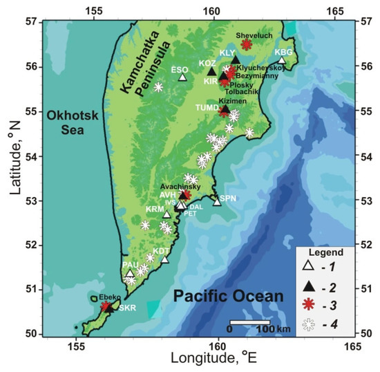 Figure 2. Location map of seismic stations and active volcanoes: 1—non-volcanic station, 2—volcanic station, 3—active volcano near which a seismic station is located, 4—active volcano at rest or near which there is no seismic station, 2011–2021.