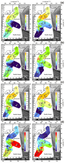 For all four statistical parameters, daily GRD files were created, representing tables of their values at the nodes of a regular grid of 50 × 50 nodes in size, covering the area in the latitude range of 50–64° N and in the longitude range of 155–168° E for the entire observation period. The distribution of each noise statistic over the territory, obtained by interpolating the median values of the parameters from the three stations closest to each node of the grid, was reflected on digital maps created using a geographic information system [44].