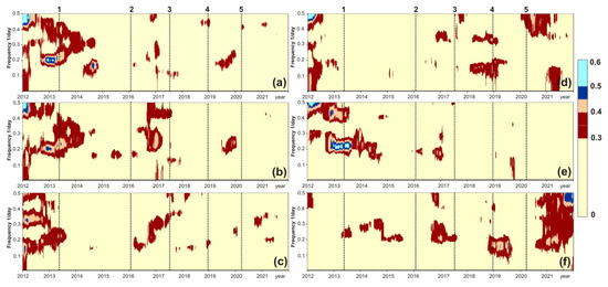 Figure 5. Time-frequency diagrams of the spectral measure of coherence of 4-dimensional time series of seismic noise parameters ν(τ, ω) in comparison with earthquakes (Table 3) according to data from (a) the entire network of stations, (b) non-volcanic, and (c) continental stations, as well as for the (d) northern, (e) central, and (f) southern groups of stations, 2011–2021. Synchronization effects of seismic noise parameters are distinguished by the values ν(τ, ω) 0.3.