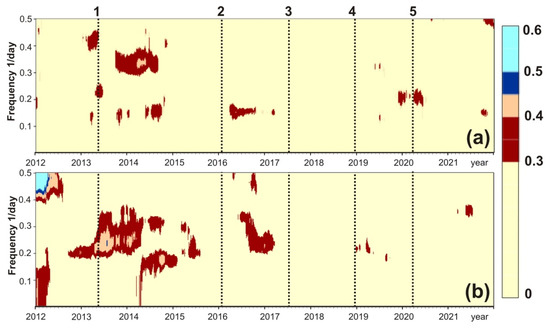 Figure 6. Time-frequency diagrams of the spectral measure of coherence of 4-dimensional time series of seismic noise parameters ν(τ, ω) in comparison with occurred earthquakes (Table 3) constructed from (a) the group of volcanic stations and (b) the group of coastal stations, 2011–2021.
