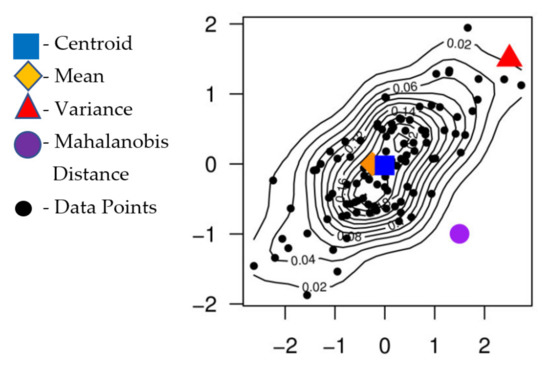 where and represent data values of the distributions, and and refer to the means of the distributions. Figure 1 is an example plot of the Mahalanobis distance in which a contour plot overlays the scatterplot of 100 random draws from a bivariate normal distribution with a mean of zero, unit variance, and 50% correlation. The centroid defined by the marginal means is noted by a blue square. It should be noted that the Mahalanobis distance is capable of detecting outliers in the bivariate space.