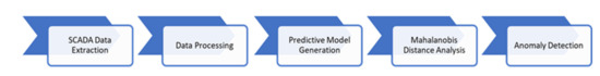 A flowchart presented in Figure 2 is used to accomplish the study’s objectives. It begins with the extraction of operational and alarm data from the SCADA system. These data are then pre-processed to filter abnormal data underlying different periods. The pre-processed data are then used to generate predictive models using the algorithm presented in [23].