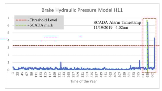 The different SCADA alarm data are then checked for correspondence with the component where the MD faulty behavior is detected. Relevant data in Table 5 show that alarm data for November for wind turbine H11 indicate a very low pressure on the yaw brake system. This corresponds to the detected anomaly in the calculated MD of the brake hydraulic pressure model. In terms of the component analysis of the different parameters, the MD approach detected the faulty behavior of the wind turbine.
