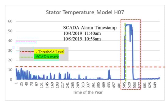 Another example is based on the stator temperature model plots for the calculated MD. Wind turbine H07 shows faulty behavior among the plots in the wind farm for stator temperature. Figure 5 shows the plot for the calculated MD for the stator temperature model for H07. Tracing the period of occurrence for this abnormal duration results in October.