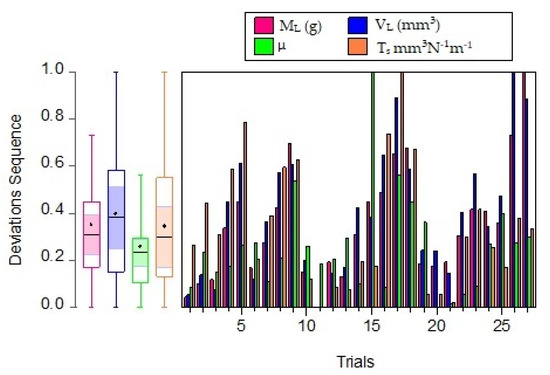 45]. The decrease in volume loss due to an increase in the sliding distance and speed is attributed to an increase in temperature at high speed, forming a layer preventing direct contact with the counter wheel face. The CF25 composite exhibited the best and worst volume loss at run 6 and 26, respectively. The minimum volume loss is related to the lower grit size, while the maximum was as a result of a higher grit size and the highly brittle nature of carbon fiber.