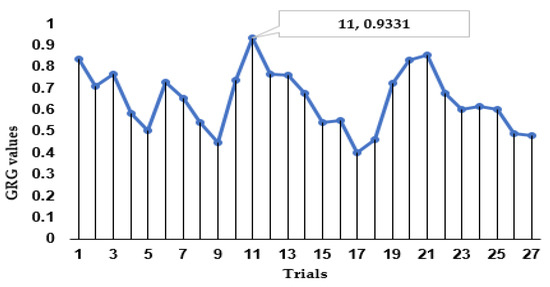 27] used the same approach hybridized with principal component analysis (PCA) for the optimization of the laser parameters of the dimple geometry of stainless steel. It was found that that optimal GRG peak value of 0.2642 was obtained at an average power of 12 W, pulse duration of 1500 ns, and a frequency of 15 Hz. ANOVA showed that average power was the most significant parameter, while depth was of little or no importance [
