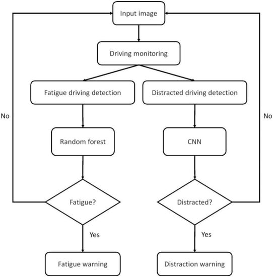 7]. There are 68 facial feature points extracted from the image, including features such as the eyes and mouth. The defined fatigue parameters are then computed using the extracted facial features. Finally, the random forest is trained to determine whether the driver is fatigued, and whether a warning message should be issued to the driver. To detect distracted driving, we mainly use a data set which we collect ourselves. This data set contains data in seven categories, with six categories reflecting common types of distracted driving and one category reflecting safe driving. A CNN trained on our distracted driving data set is used for testing. A warning signal for distracted driving is generated when some positives are detected in the acquired image sequence.