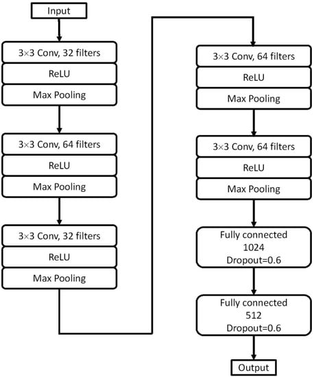 Figure 4 shows the convolutional neural network structure used for distracted driving detection. In the input layer, we first convert the input image to a resolution of 256 × 256 pixels. The converted image then passes through five convolutional layers with the activation function ReLU and max pooling. The advantage of using max pooling is that the CNN can run faster. After the convolutional layers, two fully connected layers are combined with ReLU and Dropout. Dropout is included to prevent over-fitting. Finally, the output layer comprises a fully connected layer with a softmax activation function for classification. We use the Adam optimizer for enhanced optimization performance. In the Kaggle distracted driving competition, the log loss was used as an evaluation. Therefore, we use the log function of Log