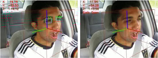 Figure 5 indicated the detection of eye opening and closing using the CNN and EAR metrics. The orientation of the face was also reflected in the direction of head posture.