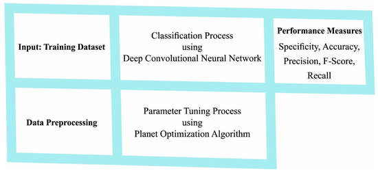 The experimental validation of the PODCNN-LWID model is tested using a dataset comprising 5500 samples with 11 classes, as depicted in Table 1. We used the CICIDS2017 dataset, which is comprised of normal and the most up-to-date common attacks, and resembles the true, real-world data (PCAPs). The dataset is available at https://www.unb.ca/cic/datasets/ids-2017.html (accessed on 13 June 2022). It encompasses the network traffic analyses results from the use of CICFlowMeter, with labeled flows based on the time stamp, source and destination IPs, source and destination ports, protocols, and attacks (CSV files). This dataset was gathered for five continuous days (Monday–Friday), with various attacks as well as normal information. The proposed model is simulated using the Python tool. The set of measures used to examine the results are accuracy, precision, recall, specificity, and F-score.