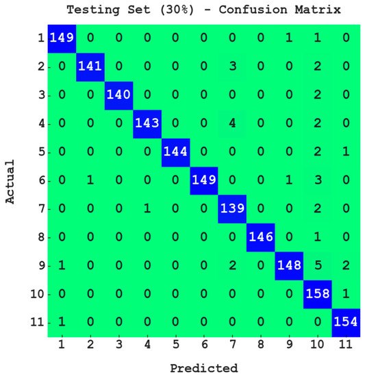 Figure 5 exemplifies the confusion matrix presented by the PODCNN-LWID approach with 30% of the TS data. The PODCNN-LWID technique identifies 149 samples in class 1; 141 samples in class 2; 140 samples in class 3; 143 samples in class 4; 144 samples in class 5; 149 samples in class 6; 139 samples in class 7; 146 samples in class 8; 148 samples in class 9; 158 samples in class 10; and 154 samples in class 11.