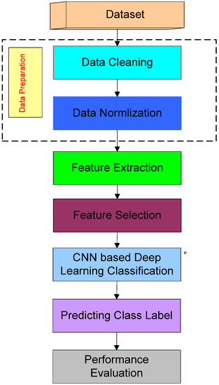 We used the stress professional’s dataset. In the initial stage, the cleaning of the data is performed; the data are normalized; the required features are extracted; and later, the desired features are selected for further processing. To classify images, the CNN-based deep learning model is applied to the selected features, and new values are predicted. Finally, a performance evaluation is conducted on the new model.