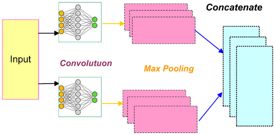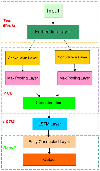 where indicates the convolution kernel function with height , and represents the output after convolution. Consequently, the maximum pooling layer is utilized to pool all convolved results concerning the extracted feature set of text, shown in Equations (5) and (6) as follows:
