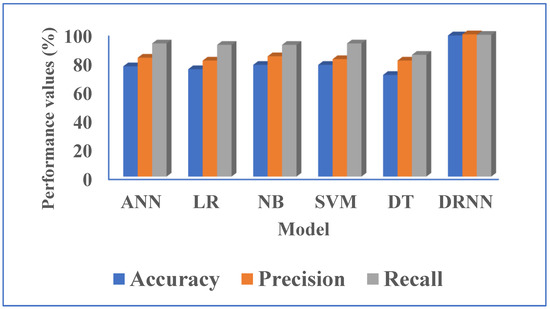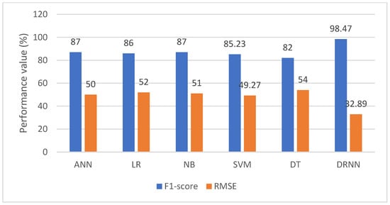 TP stands for True Positives, TN stands for True Negatives, FP stands for False Positives, and FN stands for False Negatives. The Accuracy, Precision, and Recall measures of the existing and proposed classification techniques are shown in Table 1 and Figure 5. As a result, the RMSE and F1-Score of the existing techniques, namely, ANN, LR, NB, SVM, and DT, and the proposed classification technique are shown in Table 2 and Figure 6. Typically, the performance of a prediction system is determined by these factors, with the number of features/attributes used to train the data model having a significant impact on the accuracy of a working professional’s stress prediction. The proposed DRNN technique outperforms the other techniques in terms of Accuracy, Precision, Recall, F1-Score, and RMSE values, as evidenced by the results. This demonstrates that the proposed DRNN-based working professional stress prediction technique outperforms other techniques in terms of overall performance.