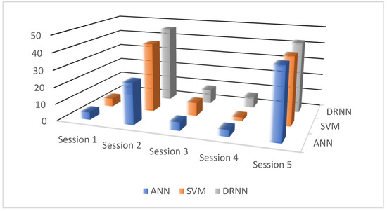 Furthermore, the prediction performance of the existing SVM and ANN techniques and the proposed DRNN technique is assessed using a variety of working professionals’ sessions, as shown in Figure 7 and Table 3. Based on these findings, it is determined that the proposed DRNN technique outperforms the existing techniques because, in the proposed system, the working professionals’ stress is predicted before and after work, as well as their participation in all of the institution’s events. Additionally, the working professionals’ feedback is collected and updated with the dataset, in which the most appropriate features for improving classification performance are extracted.