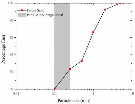 The specimens are constructed using Fujian sand, which is a standard sand that is widely used in China. This material is obtained from the Fujian area of China, which is a river clean sand containing a wide range in grain sizes. Figure 1 shows the particle size distribution of Fujian sand, while only the sand with grain size ranges from 0.1 to 0.25 mm is used to prepare the specimens. The scanning electron microscope images of the sand particles are presented in Figure 2. The particles have rough surfaces and irregular shapes. The physical properties of the Fujian sand are determined in the laboratory, as presented in Table 1.