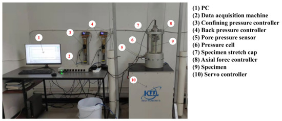 The KTL-DYN8CH cyclic triaxial test apparatus is used in this research (Figure 3). The apparatus consists of an electro-hydraulic servo controller with a double amplitude displacement of 50 mm (±0.035 mm) and an operational frequency range of 0.01–5 Hz. The confining chamber is designed to handle pressure up to 2 MPa. Three pressure transducers are equipped to measure cell pressure, back pressure, pore-water pressure, with the maximum capacity of 2 MPa, and a load transducer to measure the submersible load less than 10 kN. The testing is controlled by a fully automatic dynamic controller unit, which conveys the instructions and records the testing data with the help of the GeoSmart Lab software.