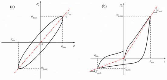 where σa, and εa are, respectively, the amplitudes of dynamic stress and dynamic strain, ω is the frequency of cyclic loading; δ is the phase lag between strain and stress. As shown in Figure 4a, the hysteresis loop is symmetric at a given strain level. Therefore, the shear modulus is usually expressed as the secant modulus determined by the extreme points on the hysteresis loop. This method is widely utilized in current practice [23], using the following equation: