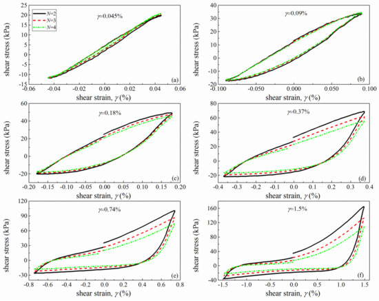 Moreover, it appears that the loading cyclic number N has a pronounced influence on the shape of hysteresis loops with the influence becoming larger as the γ increases. From Figure 6, the shear modulus shows a tendency of decrease with increasing N [7,15,19,34]. In this study, the second cyclic loading and the corresponding hysteresis loop has been utilized for determining the value of G. The influence of the hysteresis loop selection on the measured G will be discussed in the next section.
