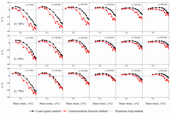 The percentage changes (δ) in the shear modulus are illustrated in Figure 8. The δ is defined as the relative difference of the shear modulus between the other three methods and the hysteresis loop method. The results of the arithmetical average method are not plotted since negligible differences (10−3 in general) are observed for all the cases considered.