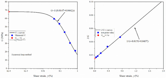For the same set of measured data in CT tests, Gmax can be found using Equations (16) and (18), respectively. As an example, Figure 9 schematically shows two methods to determine the Gmax, corresponding to G-γ curves for σc = 300 kPa and Dr = 70%. However, it should be noted that the values of a and b of Equations (16) and (17) show minor difference, since the hyperbolic and linear models are used to fit the measured data, respectively. Different coefficients of determination are also observed. Furthermore, the Gmax is calculated based on 1/a assuming γ = 0, rather than γ = 10−6. These two reasons which result in the calculated Gmax values show certain difference.
