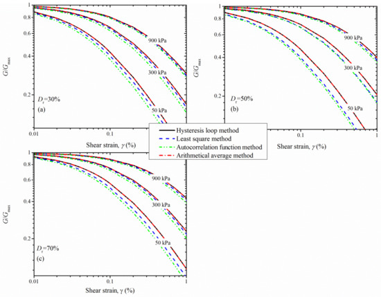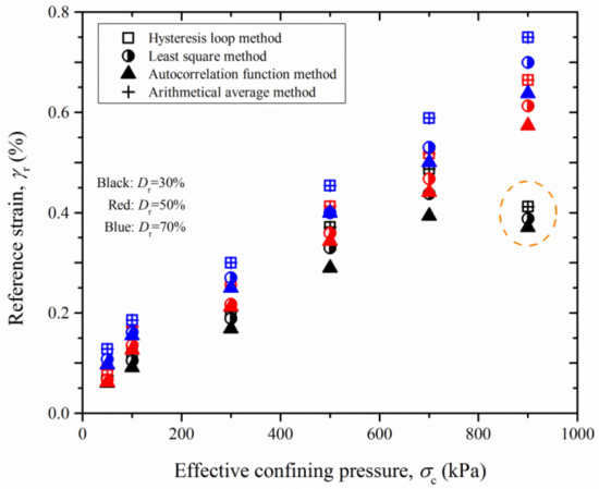 Available data of reference shear strain γr, corresponding to G/Gmax = 0.5, are reported in Figure 11 for different relative densities and effective confining pressures. A trend between γr and σc, Dr can be recognized. As σc or Dr increases, γr also tends to increase linearly. This is consistent with the findings in the literature [5,26,38]. It should be emphasized that a reduction in γr is observed for the case of σc = 900 kPa and Dr = 30%. This is probably caused by the breakage of sand particles during the testing, and more fine contents are found at the end of testing. The influence of determination methods is consistent for all the σc and Dr cases. In particular, the γr calculated by the autocorrelation function method is lower compared to the other methods while the hysteresis loop method and arithmetical average method capture almost the same γr and, on the top of that, of the least square method.